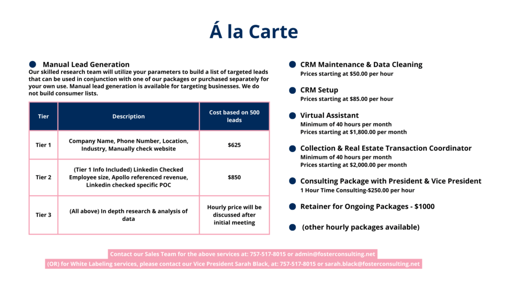 Never miss a lead with D Foster Consulting’s inbound call/email/chat services. Our expert team of U.S.-based customer support representatives will be the first point of contact for potential leads. We guarantee our support staff will provide the upscale customer experience that will leave clients eager to do business with you.