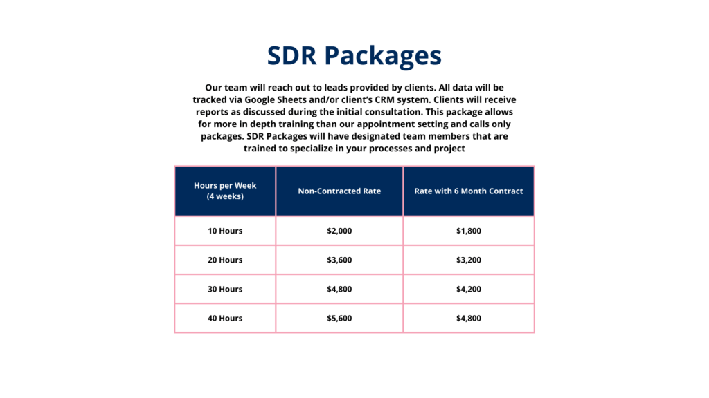 For a more personalized and in-depth approach, choose one of our SDR packages. Our Sales & Business Development Representatives are trained to specialize in your company's specific processes and projects. Each SDR and BDR is hand picked when paired with clients, to achieve optimum results for your company's success!